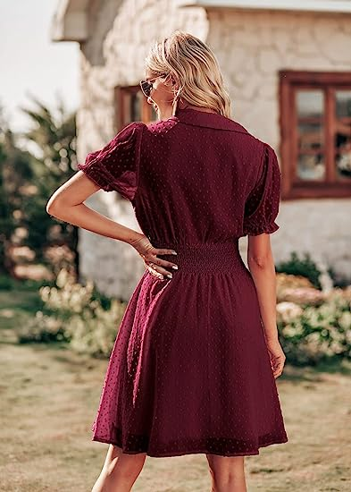 PRETTYGARDEN Women's Summer Dress Casual V Neck Short Sleeve Swiss Dots Elastic Waist A-line Flowy Mini Dresses