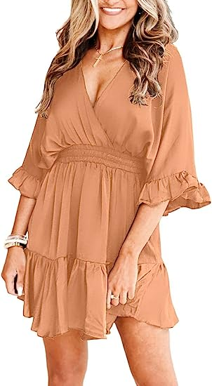 Aoysky Womens V Neck Casual Dresses Summer Loose High Waist Ruffle Pleated Cute Mini Short Dress