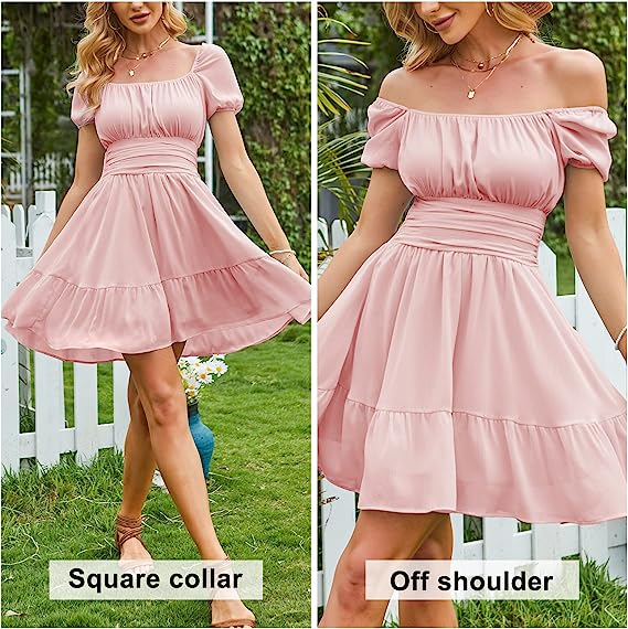 EXLURA Women's Tie Back Square Neck Short Puff Sleeve Casual Dresses A Line Sundress Mini Dress