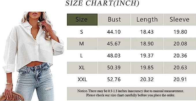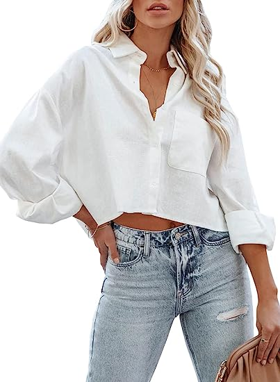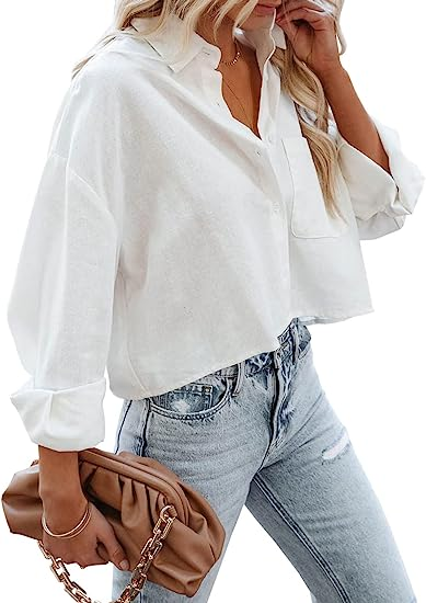 Tankaneo Womens Button Down Cropped Shirts Long Sleeve Casual Crop Tops Solid Lapel Blouse Shirt with Chest Pocket